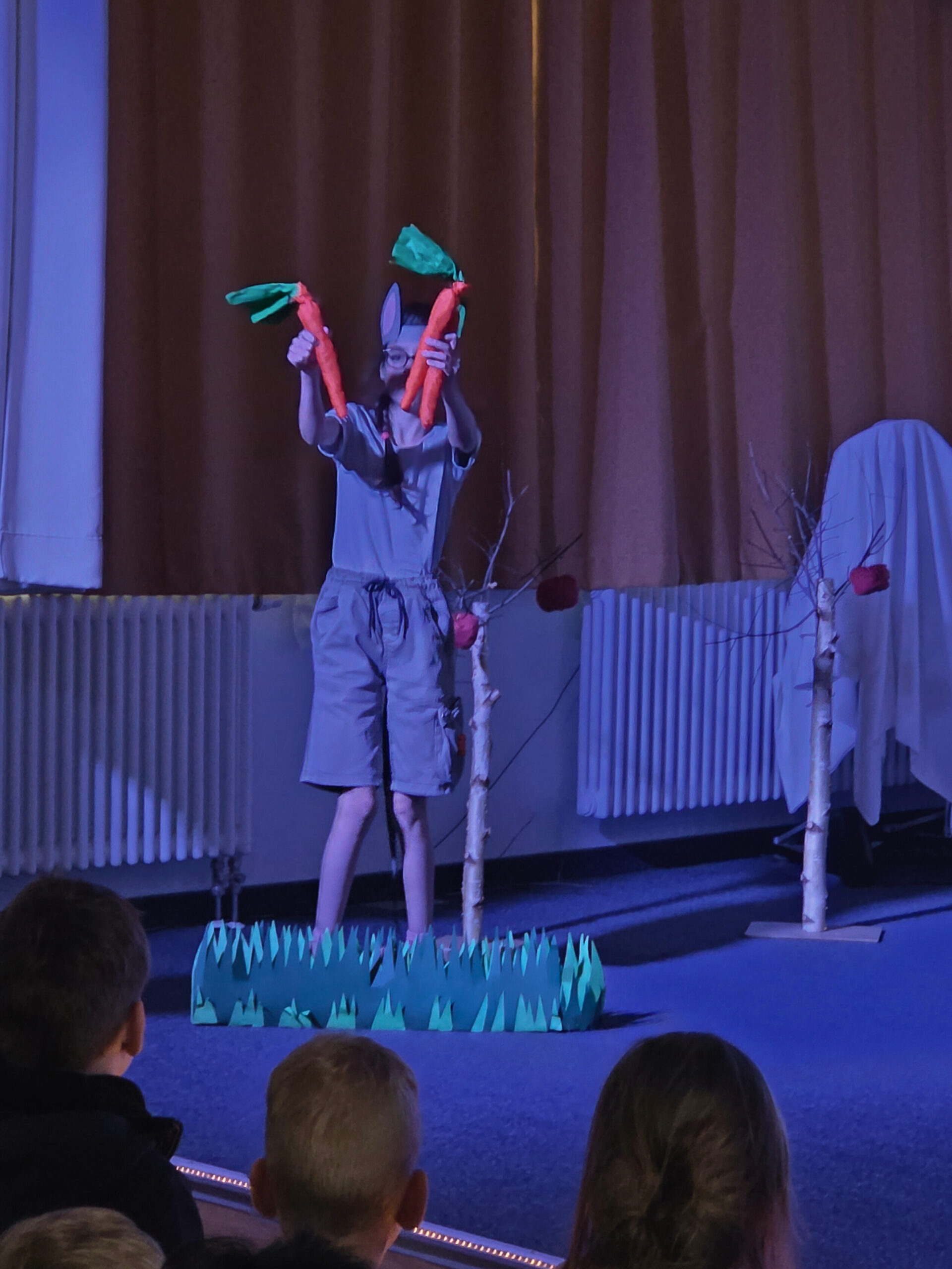 Das Fest begann mit einer gemeinsamen Begrüßung in der Aula. Die Klasse M1 eröffnete das Programm mit einem schwungvollen Tanz, der sofort gute Laune verbreitete. Mit bunten Tüchern und fröhlicher Musik zauberten die Schüler den Zuschauenden ein Lächeln ins Gesicht. Danach folgte eine Herbstpräsentation mit herbstlichen Bildern und Liedern. Ein echtes Highlight war das anschließende Theaterstück der Theater-AG: „Die Stadtmaus und die Landmaus“. Mit viel Liebe zum Detail, tollen Kostümen und großem schauspielerischem Talent erzählten die jungen Schauspielerinnen und Schauspieler die bekannte Fabel. Das Publikum war begeistert und belohnte die Darbietung mit großem Applaus.