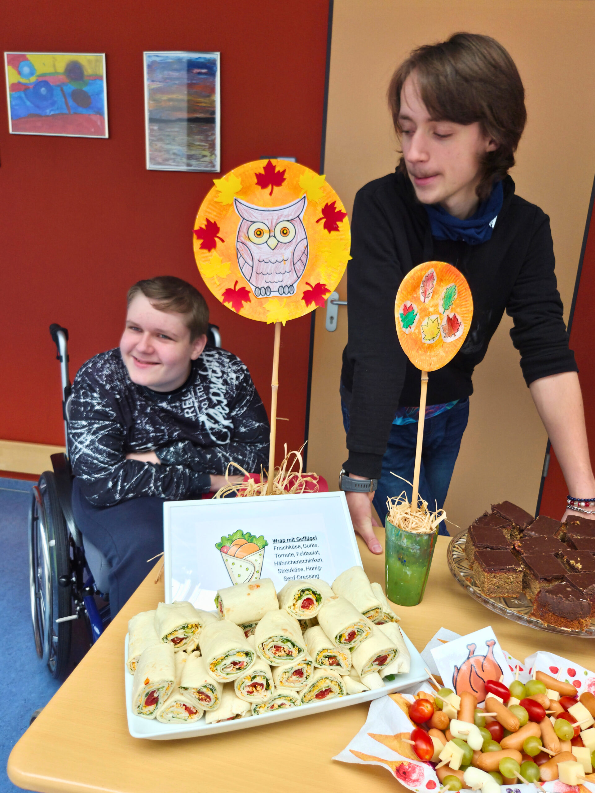 Nach dem Bühnenprogramm wartete das nächste Highlight: das große Herbstbuffet! Jede Klasse hatte dazu einen Beitrag geleistet – von selbstgebackenem Kuchen über herzhafte Wraps bis hin zu bunten Obstspießen und Lauchsuppe war alles dabei. Die Klasse W1 übernahm das Aufbauen und Ausgeben der Speisen und sorgte dafür, dass alle satt und zufrieden waren.